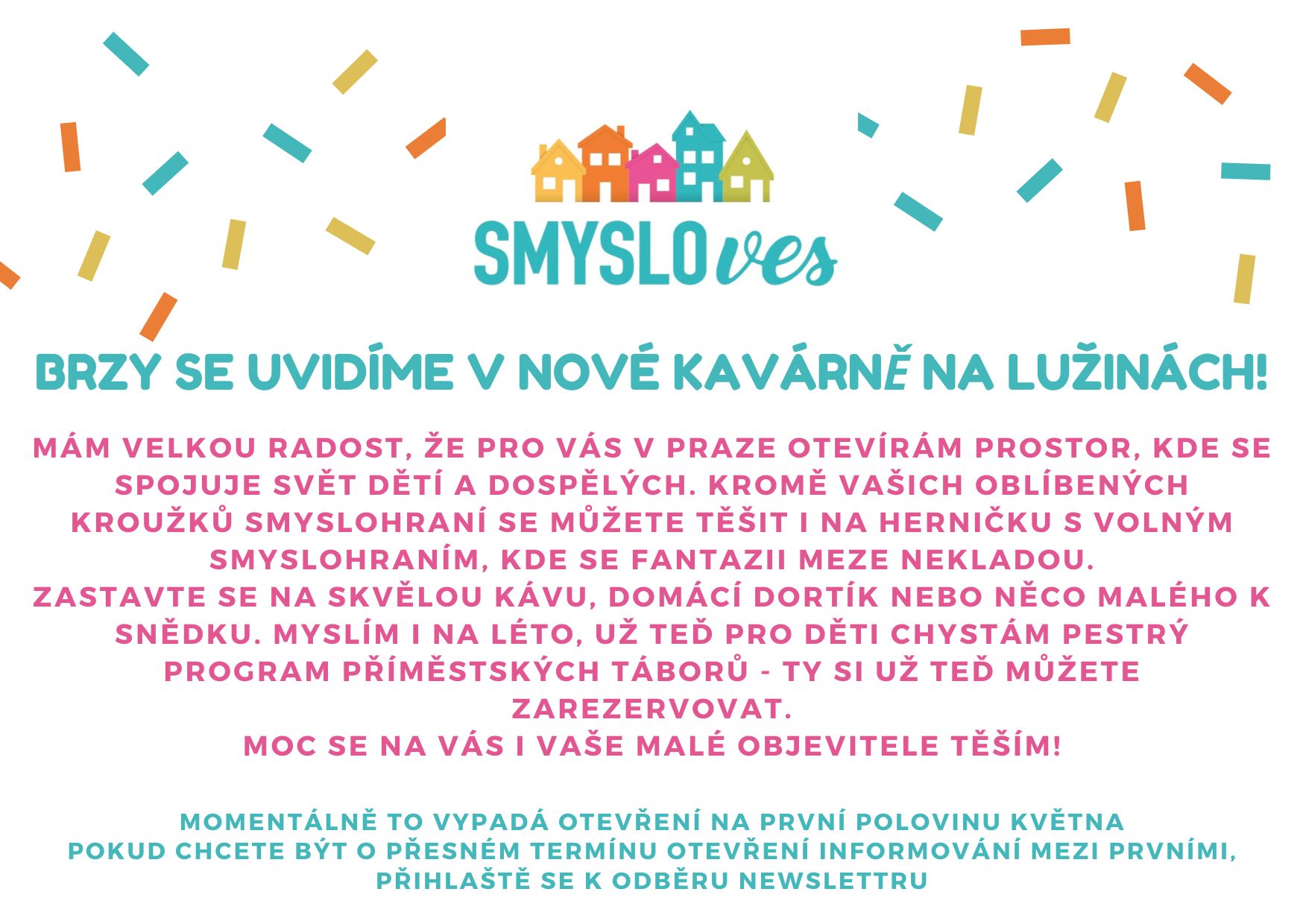 Dva roky jsme se společně potkávali na kroužcích smyslohraní a nyní nastal čas posunout náš projekt o krok dál. Už v první polovině května pro vás otevírám novou kavárničku s dětskou herničkou na Lužinách! V bezpečném rodinném prostředí si budete moci v klidu vychutnat šálek lahodné kávy, zatímco si vaše děti budou hrát. Těšit se můžete nejen na volné smyslohraní i bezpečnou zónu pro ty nejmenší.