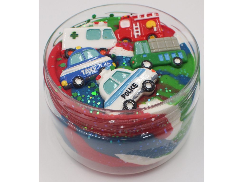 Čtyřbarevná domácí modelína s perleťovými třpytkami 250g, třpytky, dekorace 5ks dopravních prostředků.