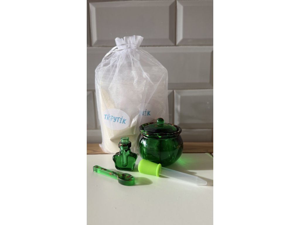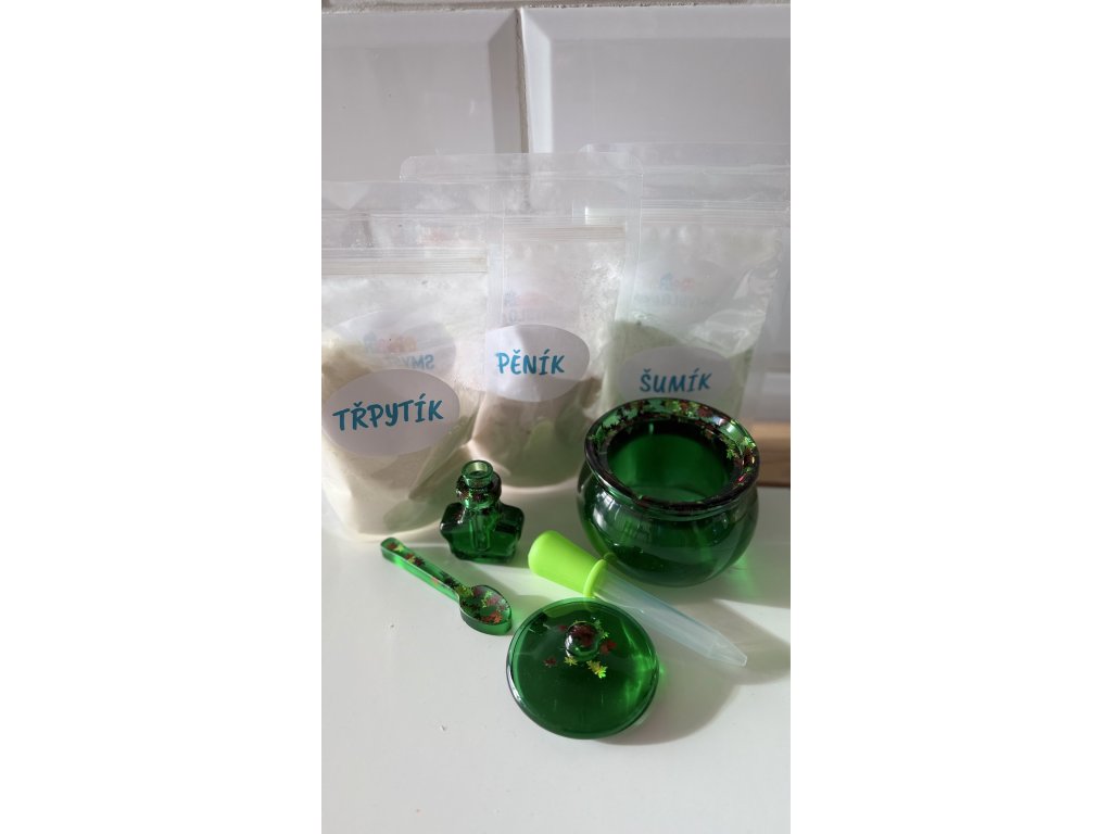 Kotlík z pryskyřice v náhodných barvách se třpytky, lžička z pryskyřice, malá lahvička z pryskyřice (vše stejně barevné a zdobené), kapátko, 3x150g šumící směsi (Šumík- zelená, Pěník-červená, Třpytík-žlutá)